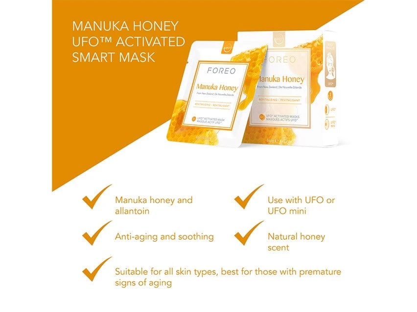 FOREO UFO Activated Mask – Manuka Honey smooths and revitalizes skin.
