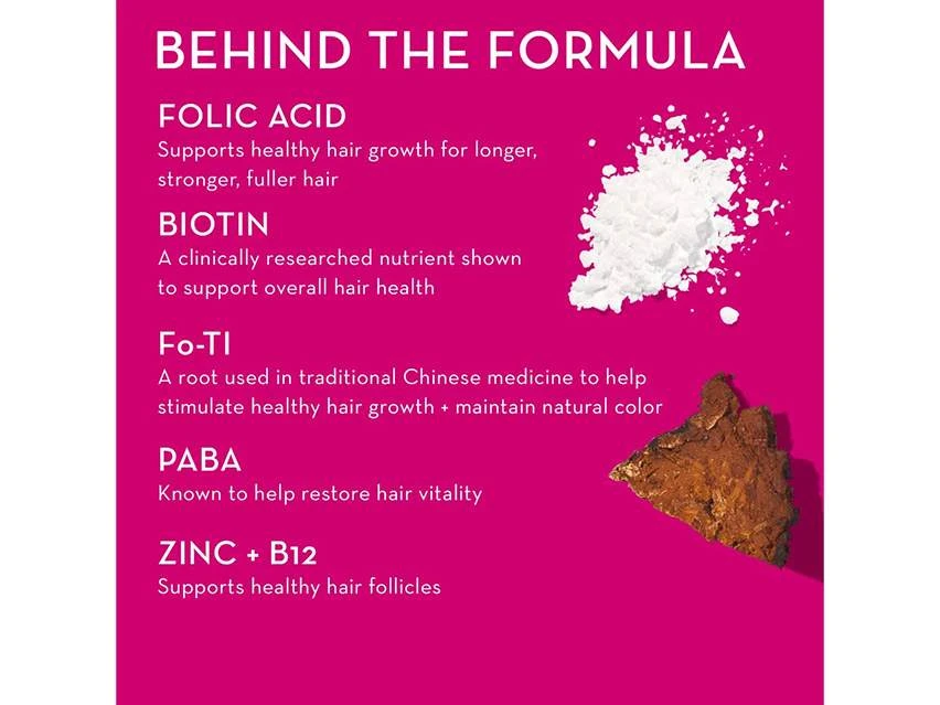 These delicious berry flavored gummies use vitamin B12 to promote healthy hair and stimulate hair growth. Featuring a unique combination of clinically researched nutrients for stronger, healthier hair including, these daily supplements include: biotin, zinc, B12, PABA (to boost hair color), folic acid and Fo-Ti. It also supports hair pigmentation for healthy hair color.