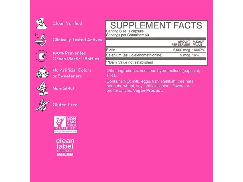 This plant-based biotin supplement supports longer, stronger, healthier nails and hair. Featuring a high-potency formula necessary for nail growth, this water soluble, biotin-rich supplement works to strengthen both your hair and nails as it promotes cell growth and the production and metabolism of fat into amino acids.