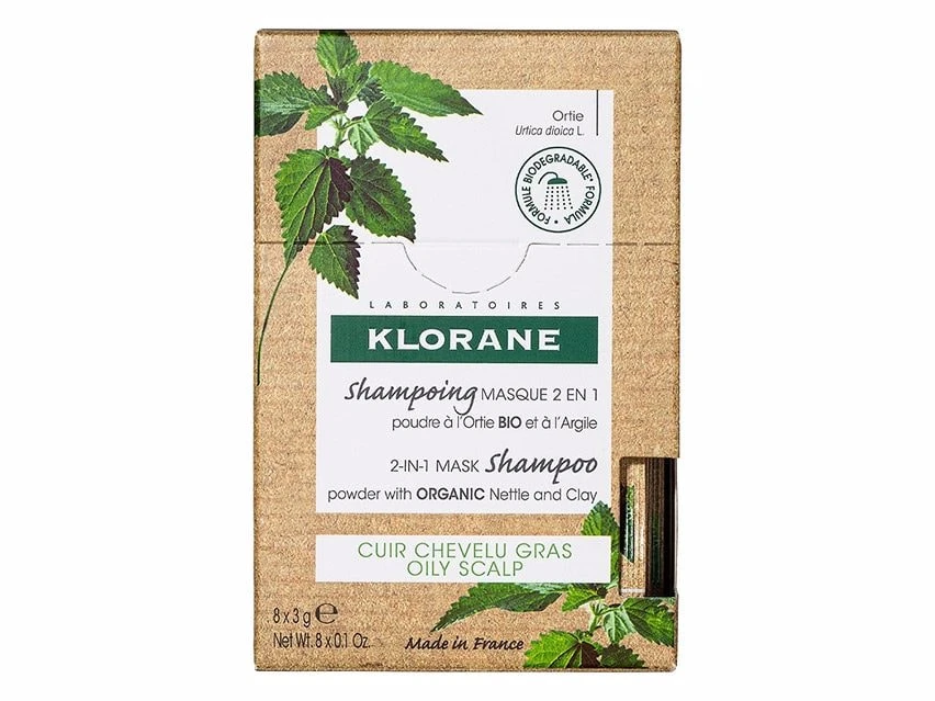 Klorane 2 in 1 Mask Shampoo Powder with Nettle and Clay absorbs oil for cleaner, lighter hair.