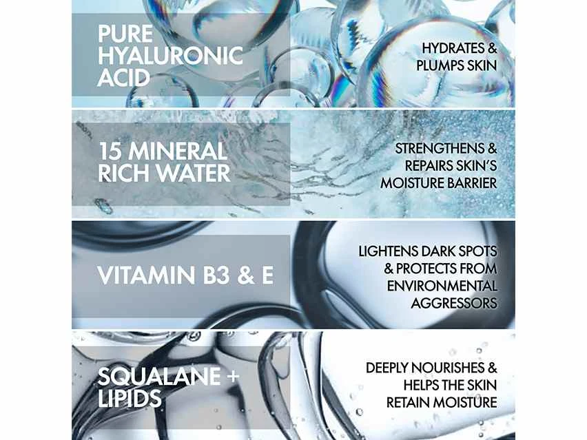 This cream is made with a rich texture that leaves dry and dehydrated skin feeling silky smooth. Hyaluronic acid and mineral-rich Vichy Volcanic Water hydrate skin for up to 72 hours, keeping it feeling soft, refreshed and calm.
