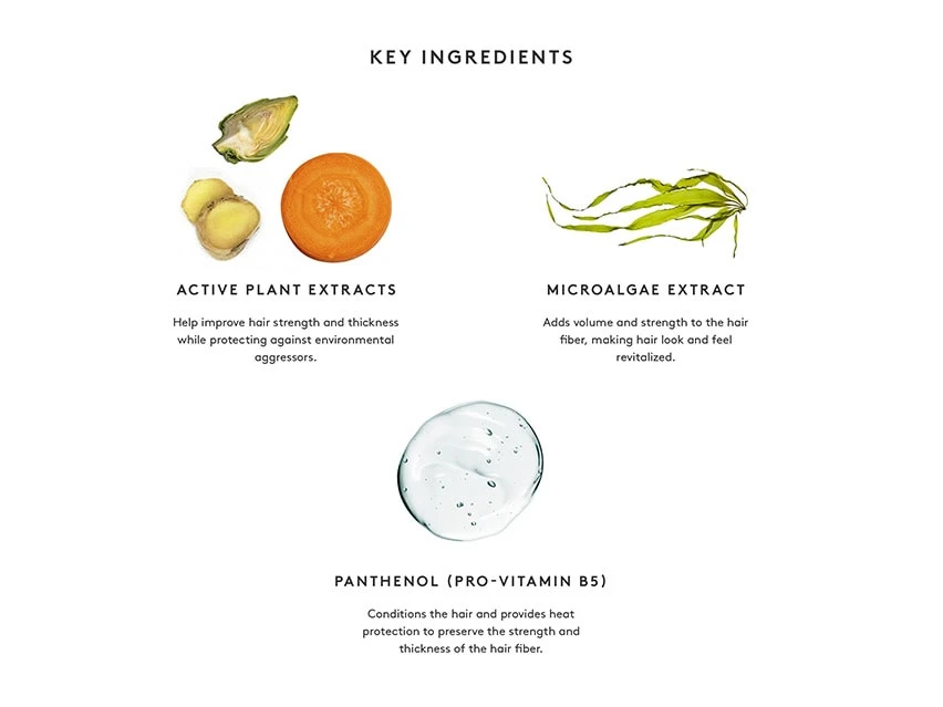 This styler for fine, fragile hair creates instant volume and body while caring for weak strands. Alpha Keratin 60ku repairs damaged strands from the inside out while panthenol, also known as pro-vitamin B5, provides heat protection and preserves the thickness of the hair fiber. Microalgae and plant extracts add volume while helping protect against environmental factors.