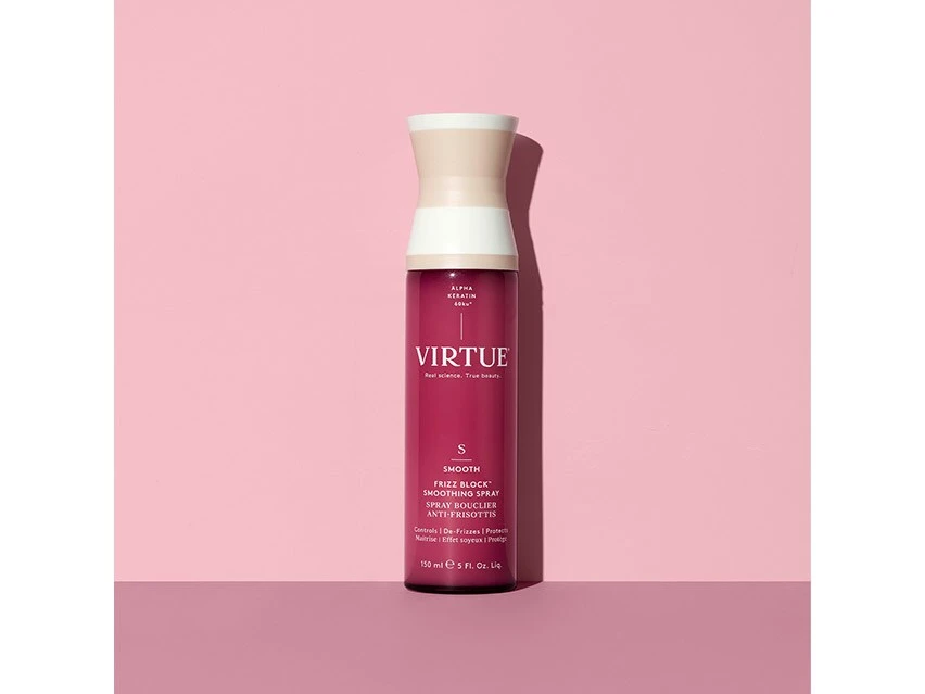 VIRTUE Frizz Block Smoothing Spray keeps hair smooth and protected.